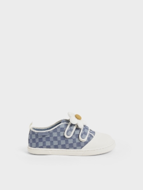 Chloe Robertson creates a chic and sporty look by layering a yellow sweater vest over a white t-shirt and denim jeans. She puts the finishing touches on her outfit with a stylish visor and eye-catching check-print sneakers. The sneakers feature adorable flower embellishments that add girlish charm to the mini fashion influencer’s ensemble and keep her look sweet and playful.