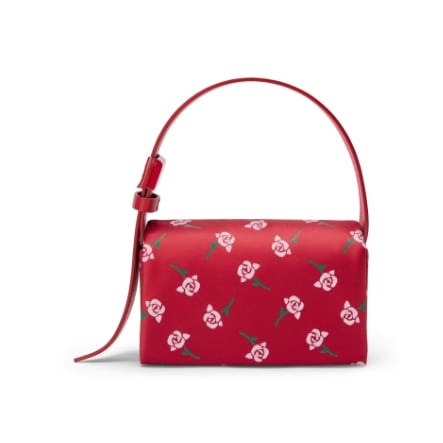 Handbags in the collection take on an elegant rectangular shape, with a wide, adjustable ribbon-like strap that allows it to be carried underarm or as a top handle. The black version is crafted from sleek satin and adorned with a patent rose in the same shade, while its crimson counterpart features a delicate, vintage-inspired rose motif on its glossy satin body. The bag’s interior is crafted from supple leather and finished with a hidden magnetic closure.