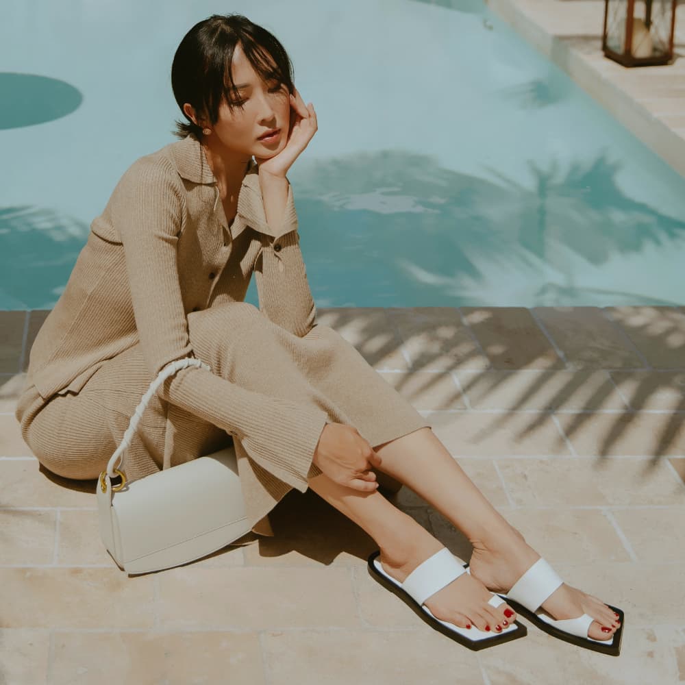 Featuring our coiled top handle shoulder bag and toe loop slide sandals
