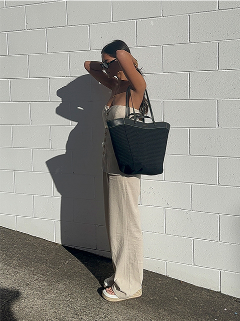 Linen clothing and woven accessories are a popular choice among fashion-forward trendsetters, particularly for creating chic summertime outfits. Mia Croft is no exception, as she embraces this trend with her own unique twist. She completes her strapless linen co-ord with the Ida knitted tote bag in black to create a striking visual contrast.
