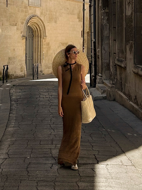You can never go wrong with a beautiful, flowy white dress for a day at the beach. Content creator Arina Orlova embraces the resort aesthetic with chic woven accessories. She completes her look with a knitted sculptural tote bag and espadrille thong sandals, while adding an extra touch of flair with a stylish straw hat.
